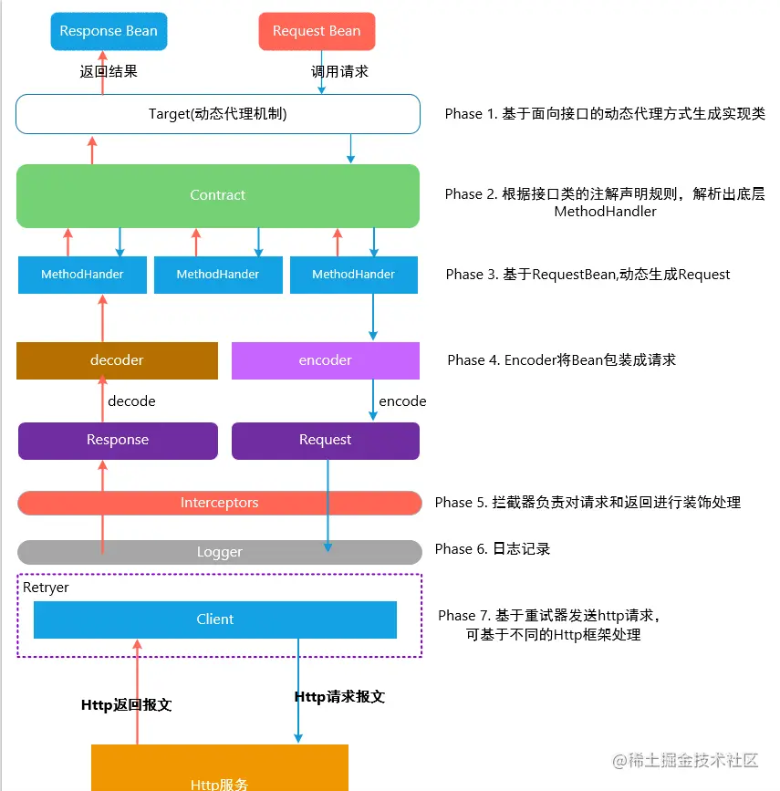 - 当业务请求真实发生时, 对于 XiaoLiuLiuService 的调用被统一转发到了由 Feign 框架实现的 InvocationHandler 中, InvocationHandler 负责将接口中的入参转换为 HTTP 的形式, 发到服务端, 最后再解析 HTTP 响应, 将结果转换为 Java 对象, 予以返回。