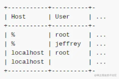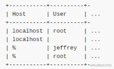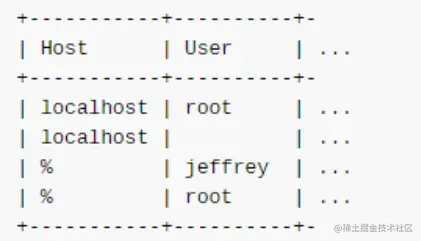 对于第二行,客户端的Host(localhost或者127.0.0.1)可以和Host字段的localhost匹配上,而第二行的用户名是空字符串,可以匹配任何用户名,所以也能匹配jeffrey,如果口令一致,则完成了匹配,到此匹配过程结束。