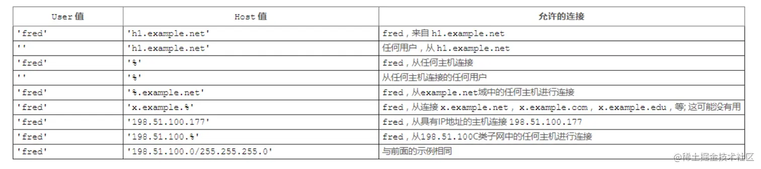 而User字段不使用匹配符%,但是如果为空字符串,则代表匹配任何用户名。