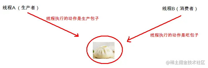 包子铺线程生产包子,吃货线程消费包子。当包子没有时(包子状态为false),吃货线程等待,包子铺线程生产包子(即包子状态为true),并通知吃货线程(解除吃货的等待状态),因为已经有包子了,那么包子铺线程进入等待状态。接下来,吃货线程能否进一步执行则取决于锁的获取情况。如果吃货获取到锁,那么就执行吃包子动作,包子吃完(包子状态为false),并通知包子铺线程(解除包子铺的等待状态),吃货线程进入等待。包子铺线程能否进一步执行则取决于锁的获取情况。