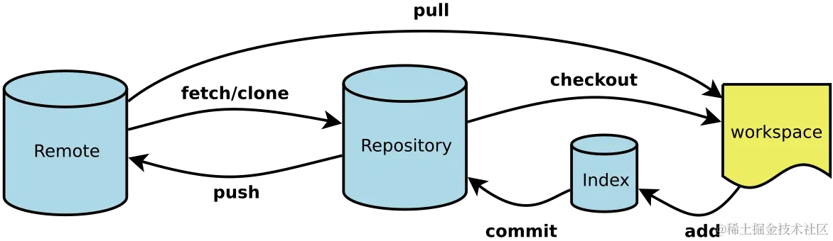 总结:平时在工作区正常开发,通过 git add 提交代码到暂存区,通过 git commit 提交代码到本地仓库,通过 git push 提交代码到远程仓库