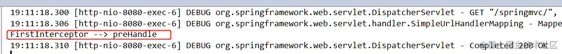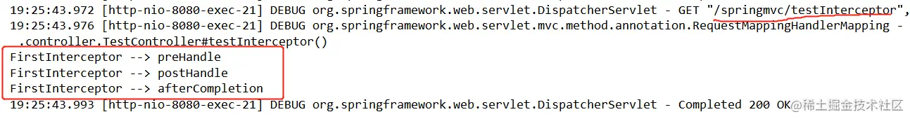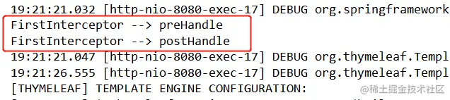 查看控制台打印输出,看到在渲染之前,前面2个方法执行了:preHandle、postHandle 。