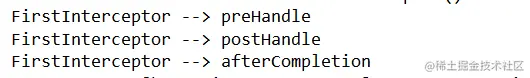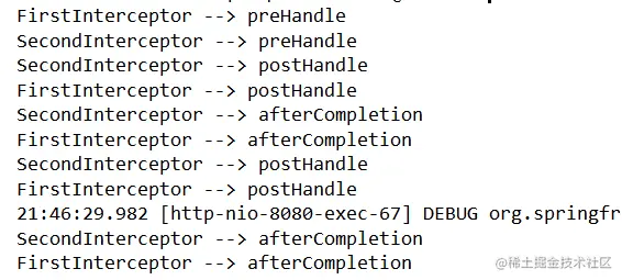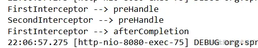 可以发现,preHandle 方法执行的顺序是 FirstInterceptor->SecondInterceptor。其他 2 个方法则是顺序倒过来。