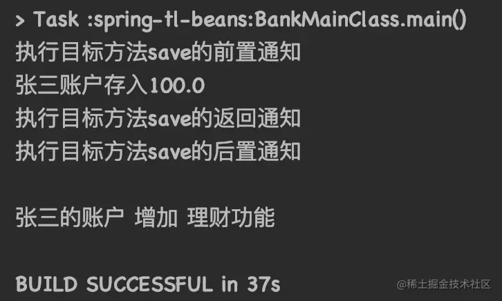 package com.lxl.www.aop.bank; import com.lxl.www.aop.Calculate; import com.lxl.www.aop.MainConfig; import com.lxl.www.aop.ProgramCalculate; import org.springframework.context.annotation.AnnotationConfigApplicationContext; public class BankMainClass { public static void main(String[] args) { AnnotationConfigApplicationContext ctx = new AnnotationConfigApplicationContext(BankMainConfig.class); Account account = new Account("张三"); Bank bank = (Bank) ctx.getBean("icbcBank"); bank.save(account, 100); System.out.println(); EnhanceFunctionOfBank enhanceFunctionOfBank = (EnhanceFunctionOfBank) ctx.getBean("icbcBank"); enhanceFunctionOfBank.Financialanagement(account); } }如上, 运行结果: