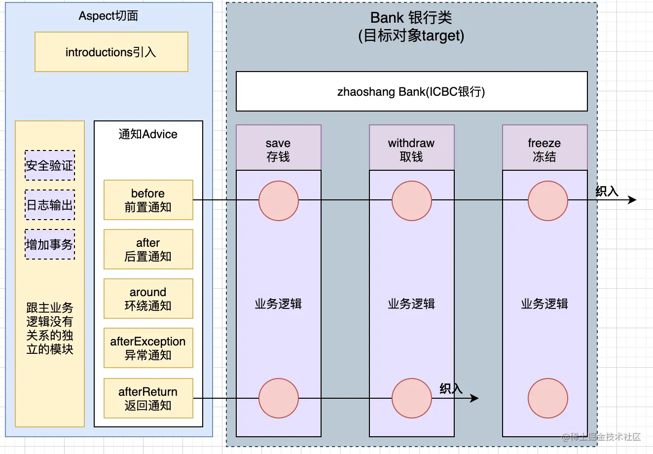 有一个银行类的实现方法. 这里面save, withdraw就是连接点. 最终会将各种通知插入到连接点中