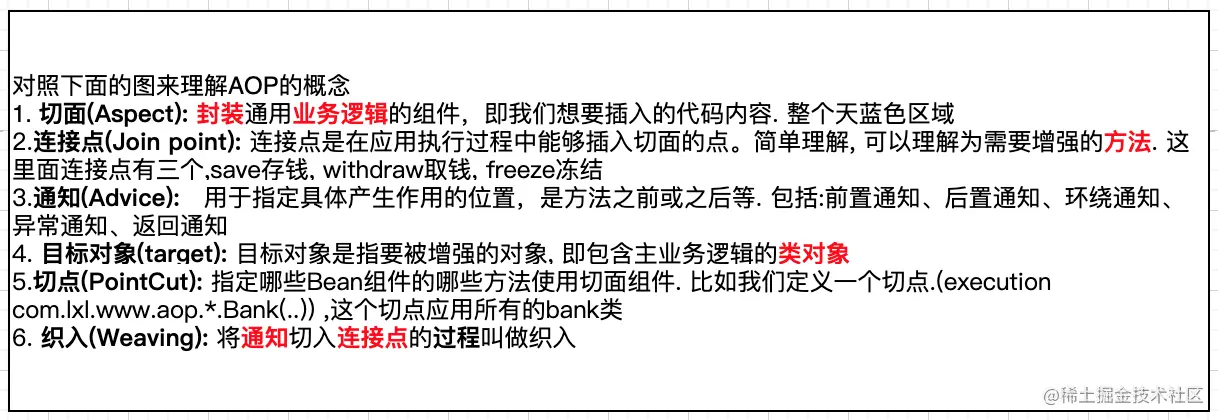 那么在Spring中使用AOP就意味着你需要哪些东西呢?我们来举个例子, 就实现上面银行的例子.