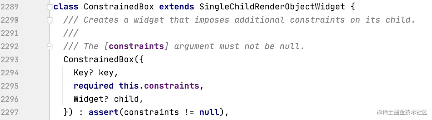 下面是 ConstrainedBox 组件类的定义和 构造方法,可以看出它继承自 SingleChildRenderObjectWidget。可接受一个子组件,在构造时必须传入 constraints 参数,其类型为 BoxConstraints 。
