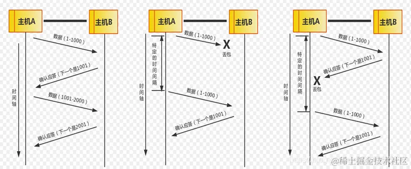 在一定时间内没有等待到确认应答,发送端就可以认为数据已经丢失,并进行重发。由此,即使产生了丢包,仍然能够保证数据能够到达对端,实现可靠传输。