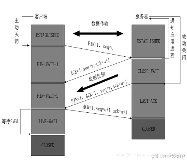 - 服务器将最后的数据发送完毕后,就向客户端发送连接释放报文,FIN=1,ack=u+1,由于在半关闭状态,服务器很可能又发送了一些数据,假定此时的序列号为seq=w,此时,服务器就进入了LAST-ACK(最后确认)状态,等待客户端的确认。