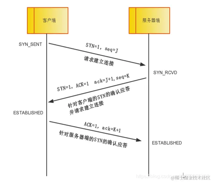 第二次握手:服务器端收到数据包后由标志位SYN=1知道客户端请求建立连接,服务器端将标志位SYN和ACK都置为1,ack=J+1,随机产生一个值seq=K,并将该数据包发送给客户端以确认连接请求,服务器端进入SYN_RCVD状态。