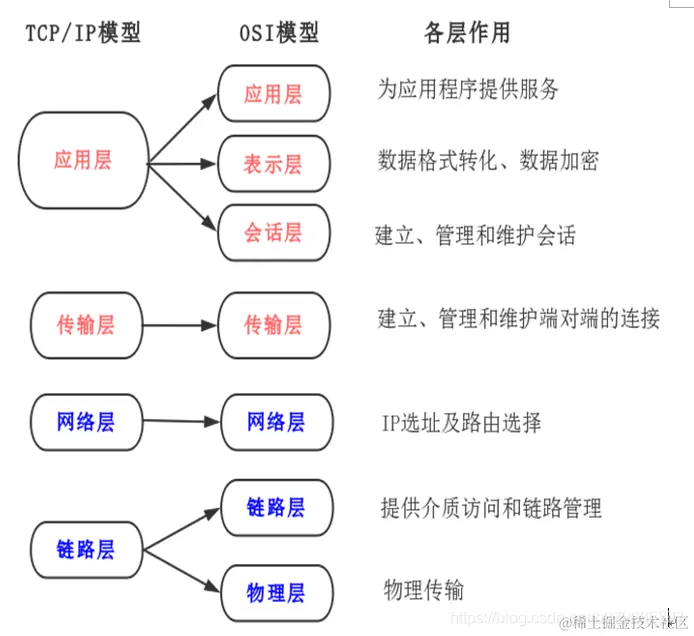 OSI模型比较复杂且学术化,所以我们实际使用的TCP/IP模型,共分4层,链路层、网络层、传输层、应用层。两个模型之间的对应关系如图所示: