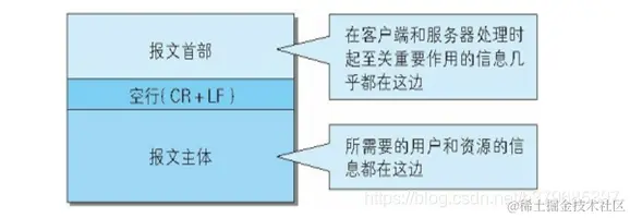 HTTP 报文大致可分为报文首部和报文主体两部分。两者由最初出现的空行(CR+LF)来划分。通常,并不一定有报文主体。