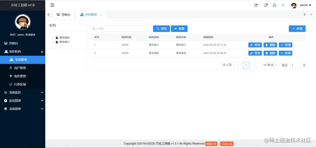 组织机构:机构管理、用户管理、角色管理、行政区域。