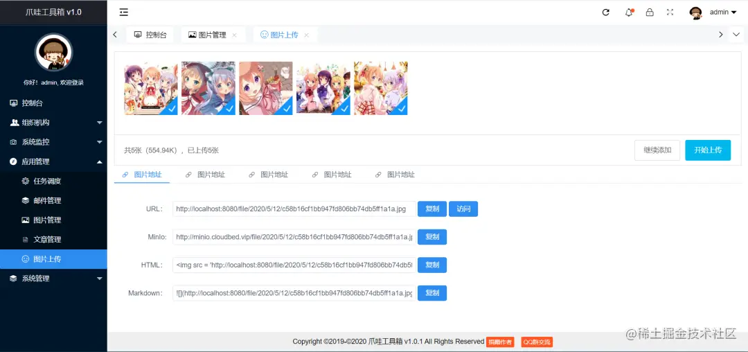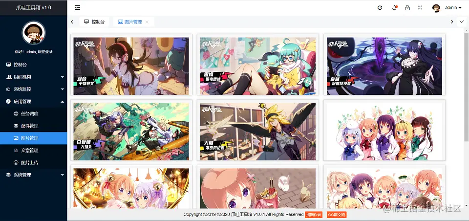 应用管理:任务调度、邮件管理、图片管理、文章管理、打卡任务、数据查询、人工智能,每个模块只需要你稍作修改就可以打造成一个项目了。