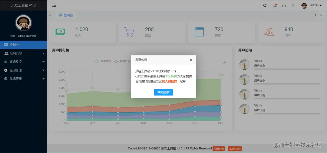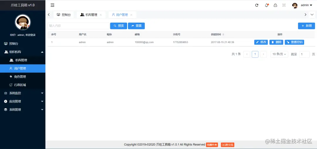 一个基于SpringBoot、JPA、Shiro的后台管理系统,单体架构,依赖少,极易上手,后端开发的福利。最重要的是还附带免费小程序以及微服务版本,可自行选择。