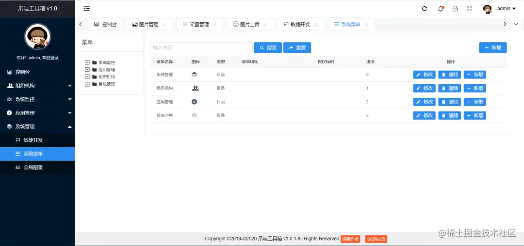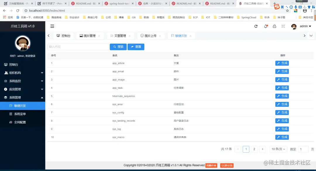系统管理:敏捷开发、系统菜单、全局配置、在线代码编辑器,小伙伴们只需要设计好表结构,三秒钟就能撸出一个增删查改的模块。
