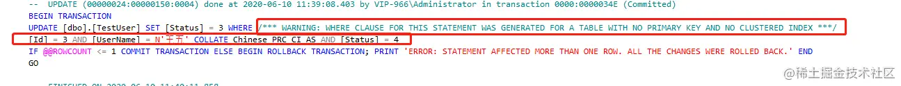 比如我把Id主键去了再更新下Status状态到4,生成的sql如下,会提示没有主键。