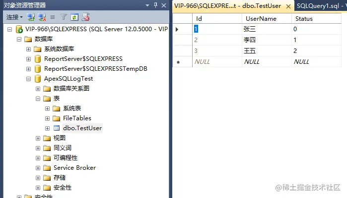 测试库ApexSQLLogTest和测试用的表TestUser,然后我手动编辑了三条数据进去,保存编辑的数据。