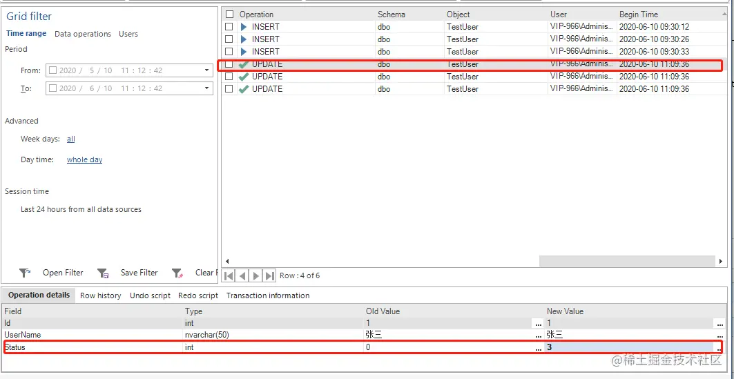 然后刷新下日志,会看到多出了三条Update日志记录,点击第一条看到下面的Status字段从0变为了3。