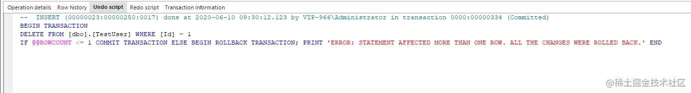 可以点击 下面的Row history查看记录,Redo script可以生成执行的操作, Undo script可以还原到之前的数据。我们恢复数据就是使用Undo script。