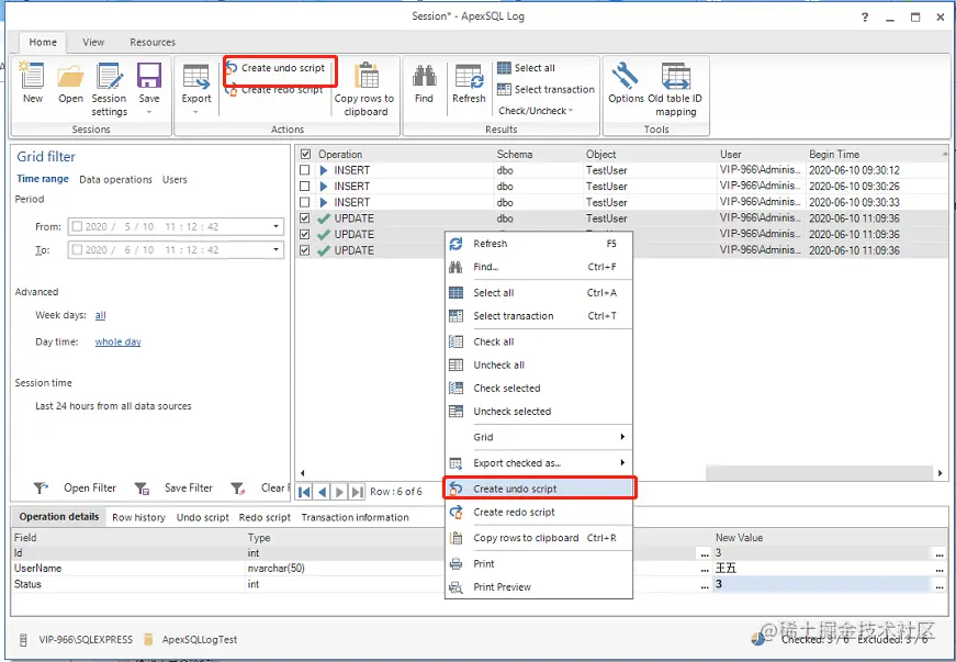 我们选中这三条记录右键或者上面的菜单栏功能,用create undo script 生成恢复sql。
