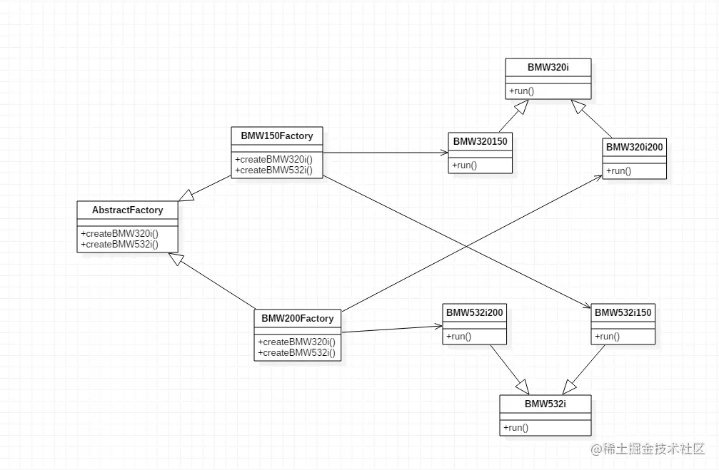 抽象工厂模式跟工厂模式最大的区别可能就是把产品再进行抽象,也就是一个抽象工厂类派生出多个具体工厂类,而具体工厂类可以生产出多个具体产品因为在现实生活中,很多产品都是一系列的,一个产品族。还按照上面的汽车的案例分析,现实生活中,你需要一台宝马,不可能说就是一种类型宝马,那宝马公司就去玩蛋蛋了,用户可能根据排量、汽车空间、稳定性、安全性各方面进行选择。所以宝马公司必须推出各个型号的子产品,例如3系和5系两款车,3系里面又包含1.5L排量的和2.0L排量的,5系同理。在实现这个需求上,我们就要对产品进行抽象,然后具体工厂写出对应的生产策略。