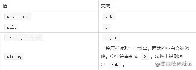 对 undefined 进行数字型转换时,输出结果为 NaN,而非 0。上述的大多数规则都容易理解和记忆。人们通常会犯错误的值得注意的例子有以下几个: