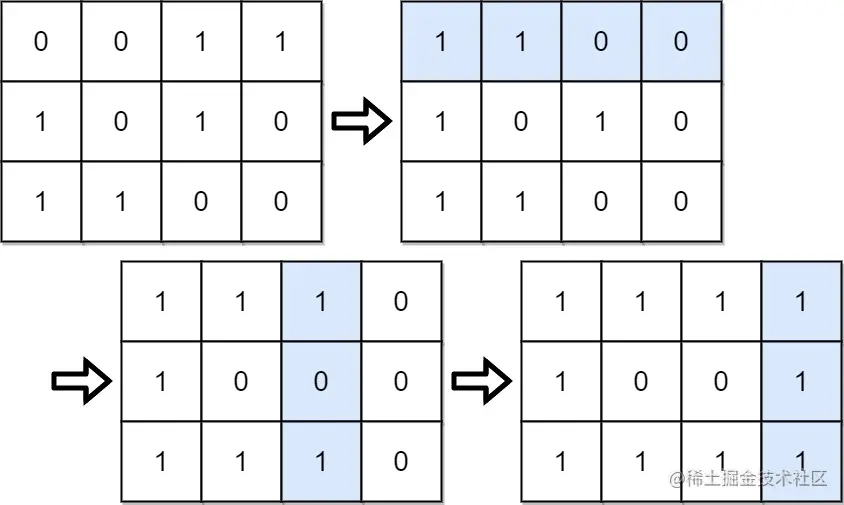 - 第一个维度就是行,每一行只要将 1 的位置尽可能地向前移动,那我们最后得到的每一行元素形成的二进制数就会越大,也就是第一个数字如果为 0 那么就进行一次操作,否则不进行操作