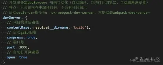 开发服务器(devServer)用来实现自动化(自动编译、自动打开浏览器、自动刷新浏览器),只会在内存中编译打包,不会有任何文件输出,本地安装webpack-dev-server后,通过npx webpack-dev-server命令启动devServer,核心代码如图3-2所示。