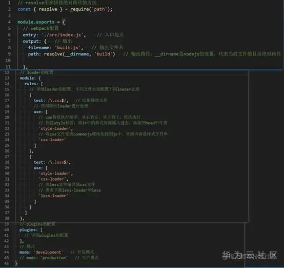 webpack.config.js是webpack的配置文件,用来指示webpack工作,运行webpack指令时,会加载里面的配置,所有构建工具都是基于nodejs平台运行的,默认采用commonjs模块化。webpack.config.js基础配置如图3-1所示。