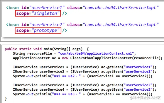 ● 对于 scope 为 prototype 的原型模式,Bean 实例是在代码中使用该 Bean 实例时才进行 装配的。