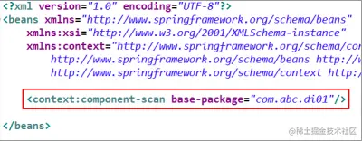 3、需要在 Spring 配置文件中配置组件扫描器,用于在指定的基本包中扫描注解。