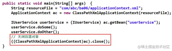 ● 要确保容器关闭。接口 ApplicationContext 没有 close()方法,但其实现类有。所以,可以将 ApplicationContext 强转为其实现类对象,或直接创建的就是实现类对象。