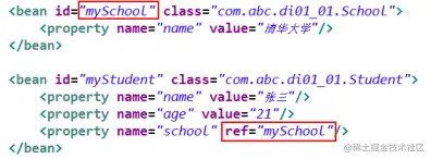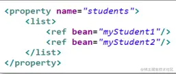 当指定 bean 的某属性值为另一 bean 的实例时,通过 ref 指定它们间的引用关系。ref 的值必须为某 bean 的 id 值。