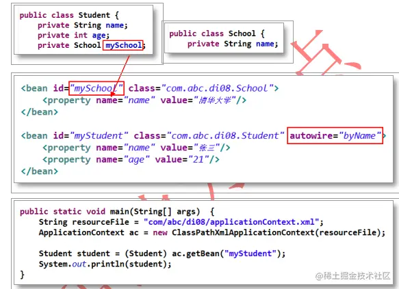 当配置文件中被调用者 bean 的 id 值与代码中调用者 bean 类的属性名相同时,可使用byName 方式,让容器自动将被调用者bean注入给调用者 bean。容器是通过调用者的bean类的属性名与配置文件的被调用者bean的id进行比较而实现自动注入的。