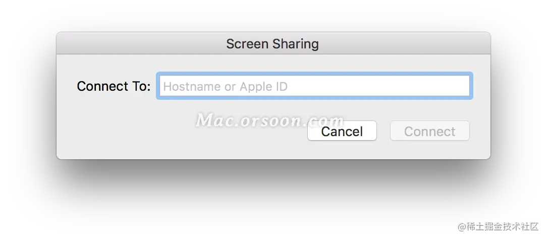 如果想启用远程协助,在Spotlight中输入Screen Sharing打开,会出现一个输入框,需要输入对方的Apple ID。之后就能进行远程协助了。
