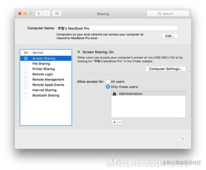 很多场景下需要用到远程协助,比如你遇到了某个搞不定的bug需要他人帮助,但是别人却不在身边,这时就需要别人通过网络来远程协助你解决问题。在Windows下有不少优秀软件,比如TeamViewer。在MAC环境下有一个自带的远程协助软件叫Screen Sharing,也十分好用。