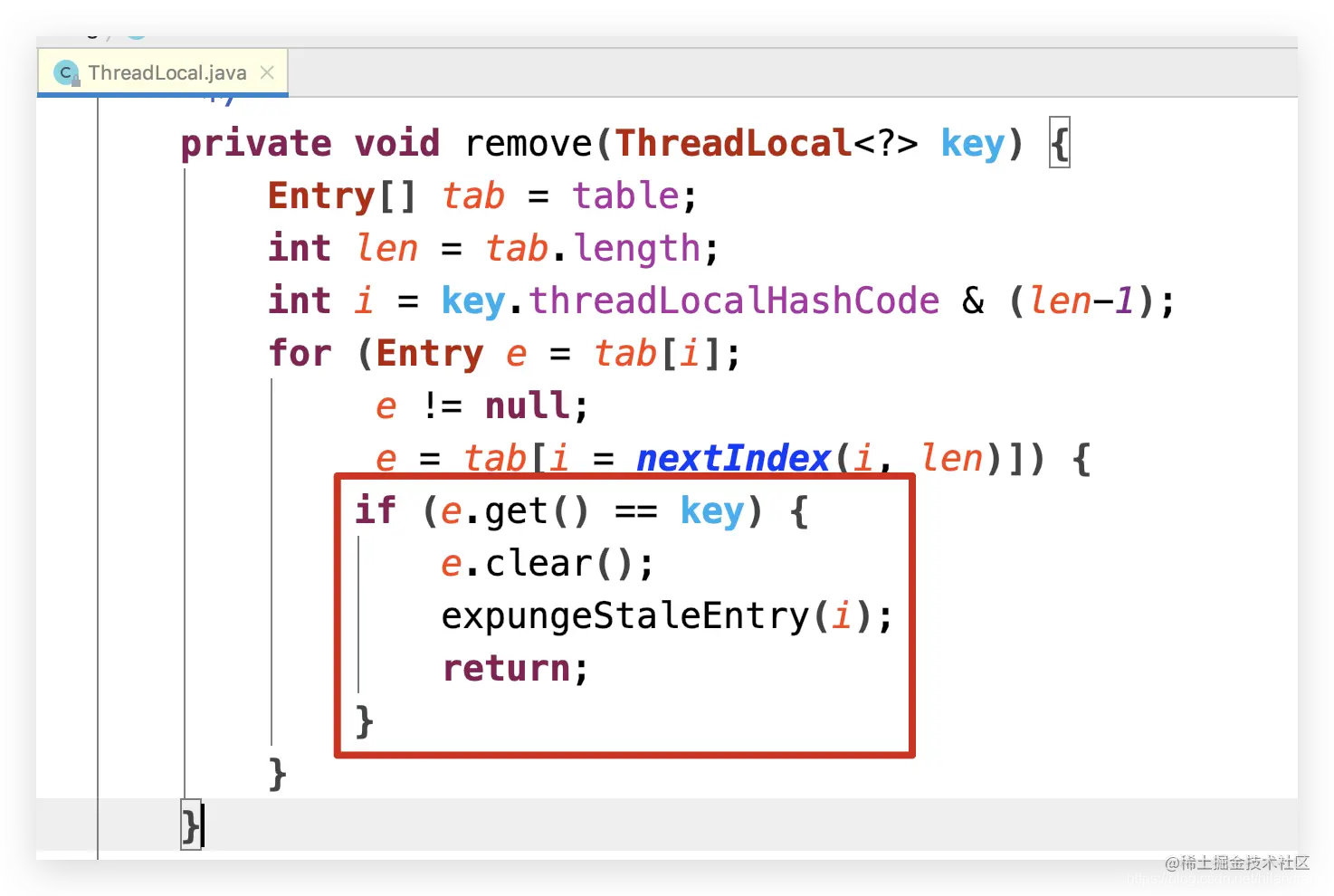 我们知道在Open Clustering HashMap中,当出现Hash冲突的时候,我们会使用探测技术去寻找下一个可用的位置。而常用的探测技术有三种:Linear Probing、Quadratic Probing和Double Hashing。那ThreadLocal中使用的是哪种探测技术呢?通过如下源码我们可以知道它使用了最简单的线性探测技术(Linear Probing)。因此TheadLocal会通过线性探测的方式不断寻找下一个位置,直到找到一个可用的位置。