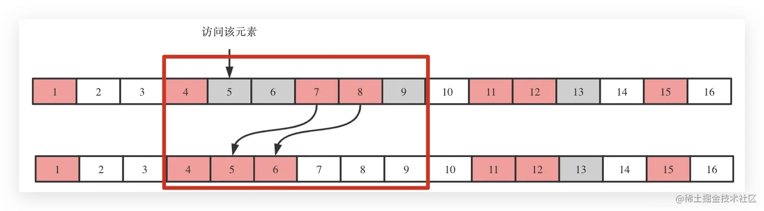 在这个过程中我们需要访问4、5、6、7、8五个元素。但是由于缓存行的特性,这5个元素极有可能被放到同一个缓存行中。这样其读取这个5个元素时,CPU根本不需要去主存读取,而是直接在CPU当前缓存行就可以读取。因此此时读取5个元素的时间和读取1个元素的时间几乎相同(CPU读取极快)。