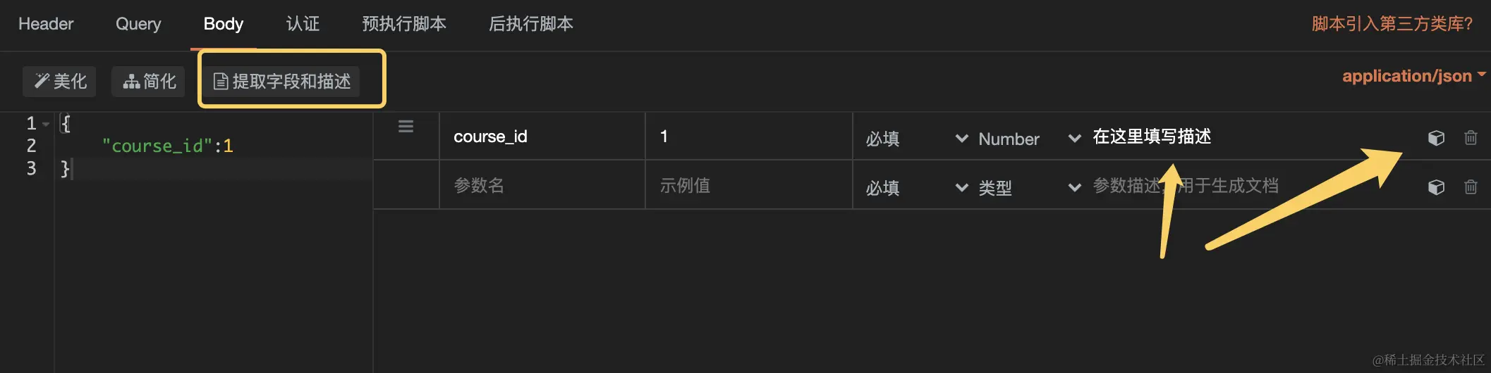 对于raw类型的body参数,我们可以通过点击“提取字段和描述”来针对参数进行描述的填写: