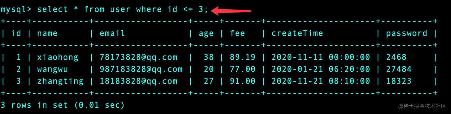 select * from user where id <= 3;