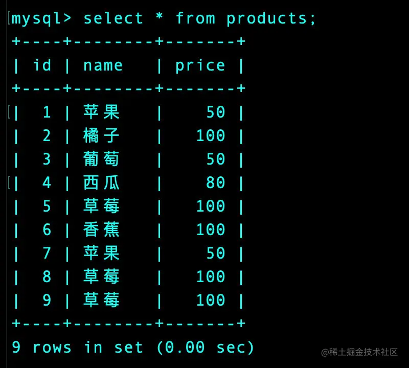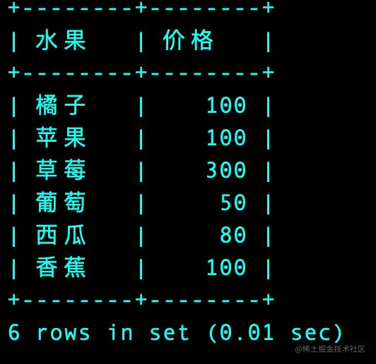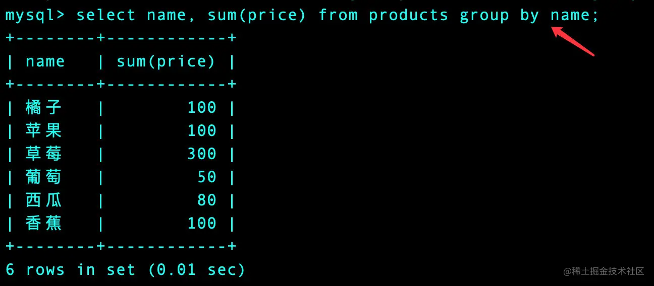 select name as 水果, sum(price) as 价格 from products group by name;