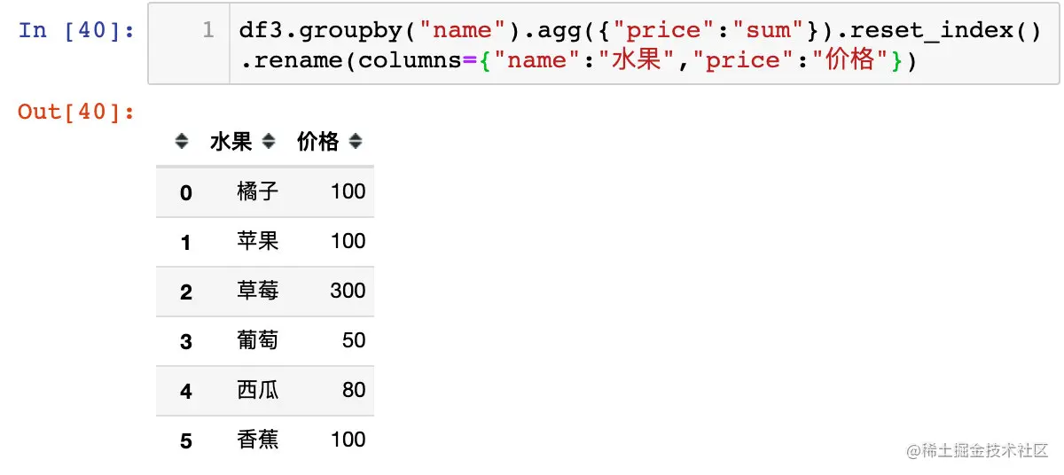 df3.groupby("name").agg({"price":"sum"}).reset_index().rename(columns={"name":"水果","price":"价格"})