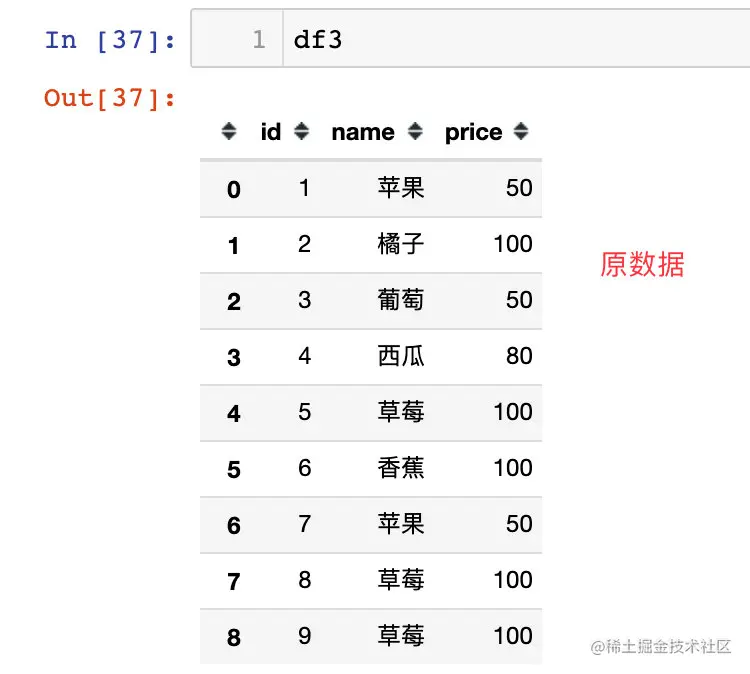 先看看df3的数据,一个水果会对应多个价格,我们水果的名称对价格汇总:
