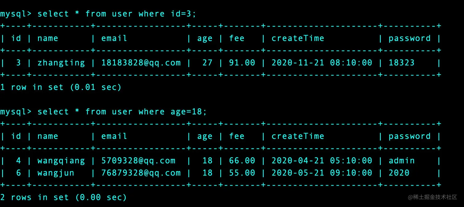 select * from user where age < 20 and fee > 60;