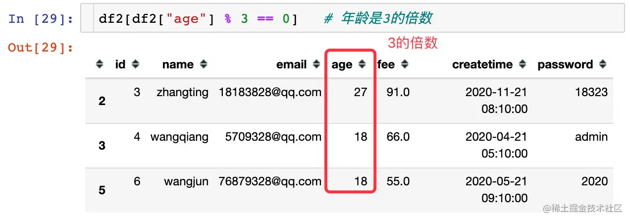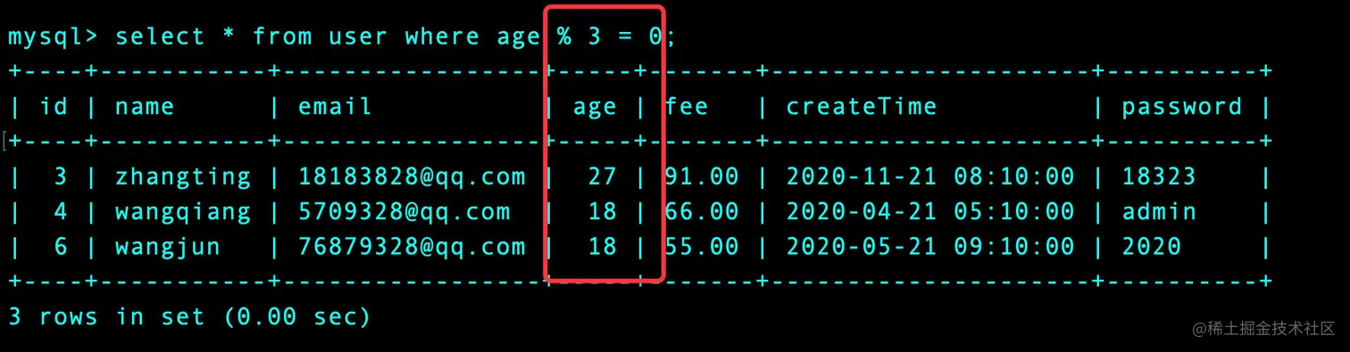 select * from user where age % 3 = 0; -- 年龄分别是3或者2的倍数