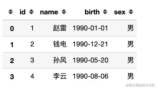 | 04 | 李云 | 1990-08-06 | 男 |