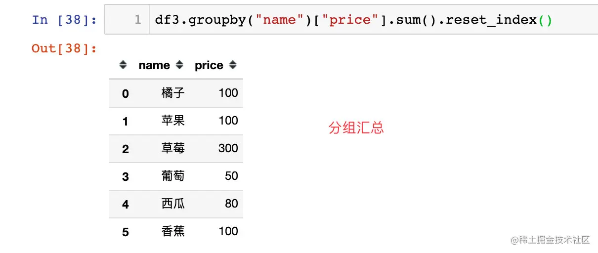 df3.groupby("name")["price"].sum().reset_index() # 方式2