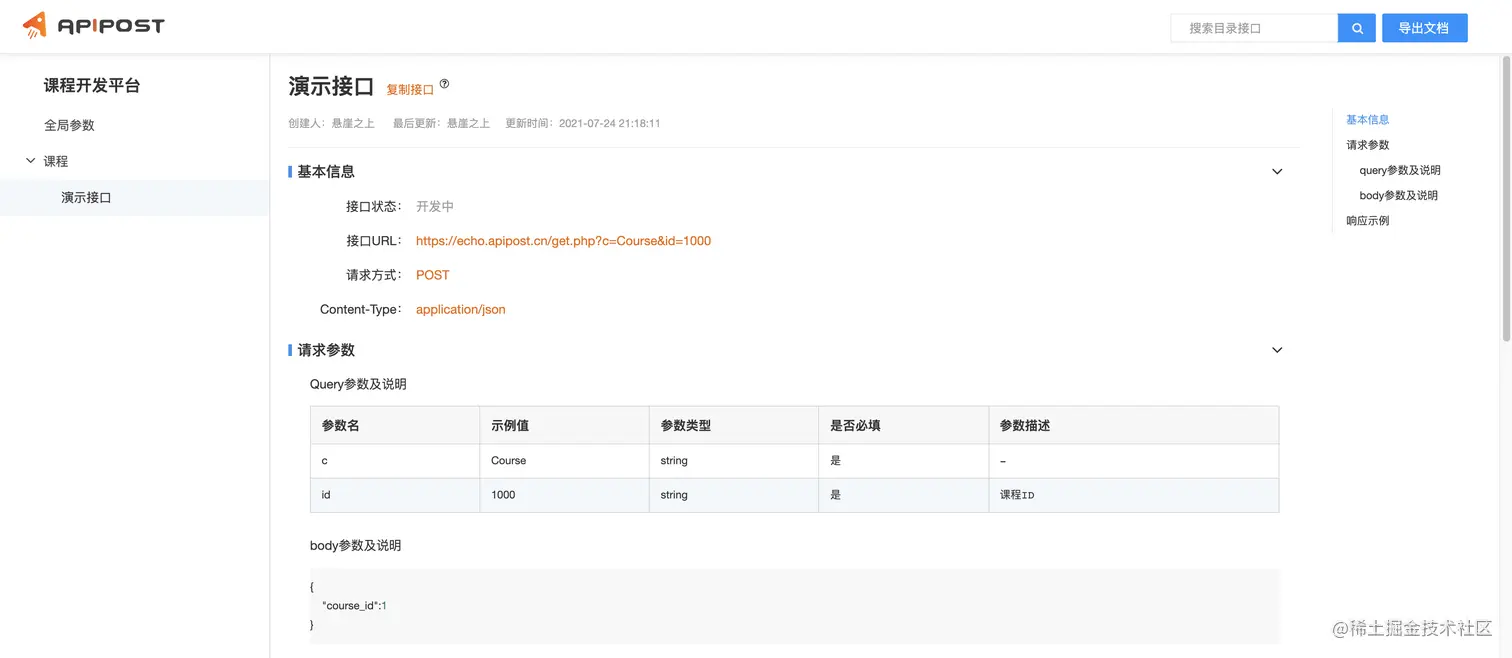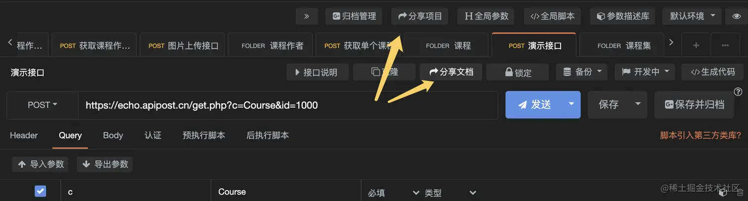 我们在“2分钟玩转APIPOST”一讲中,简单介绍了如何生成并分享接口文档: