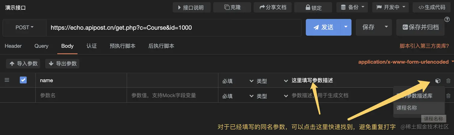 同样,对于已经填写过的参数,APIPOST会自动匹配描述,不用重复填写。